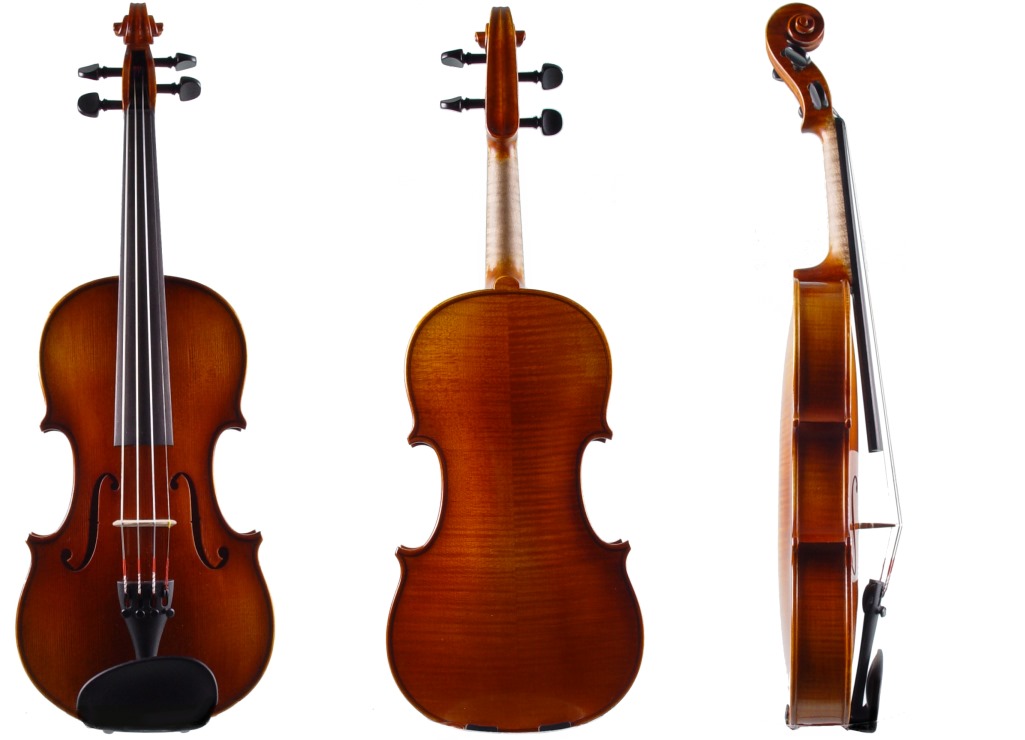 Weitere Ausstattung: 4 Ebenholzwirbel, Ebenholzgriffbrett, Markensaiten (Pirastro Tonica Saiten bzw. Thomastik Dominant, Saitenhalter mit 4 integrierten Feinstimmern. Mittiger Wittner Antiallergic Kinnhalter.