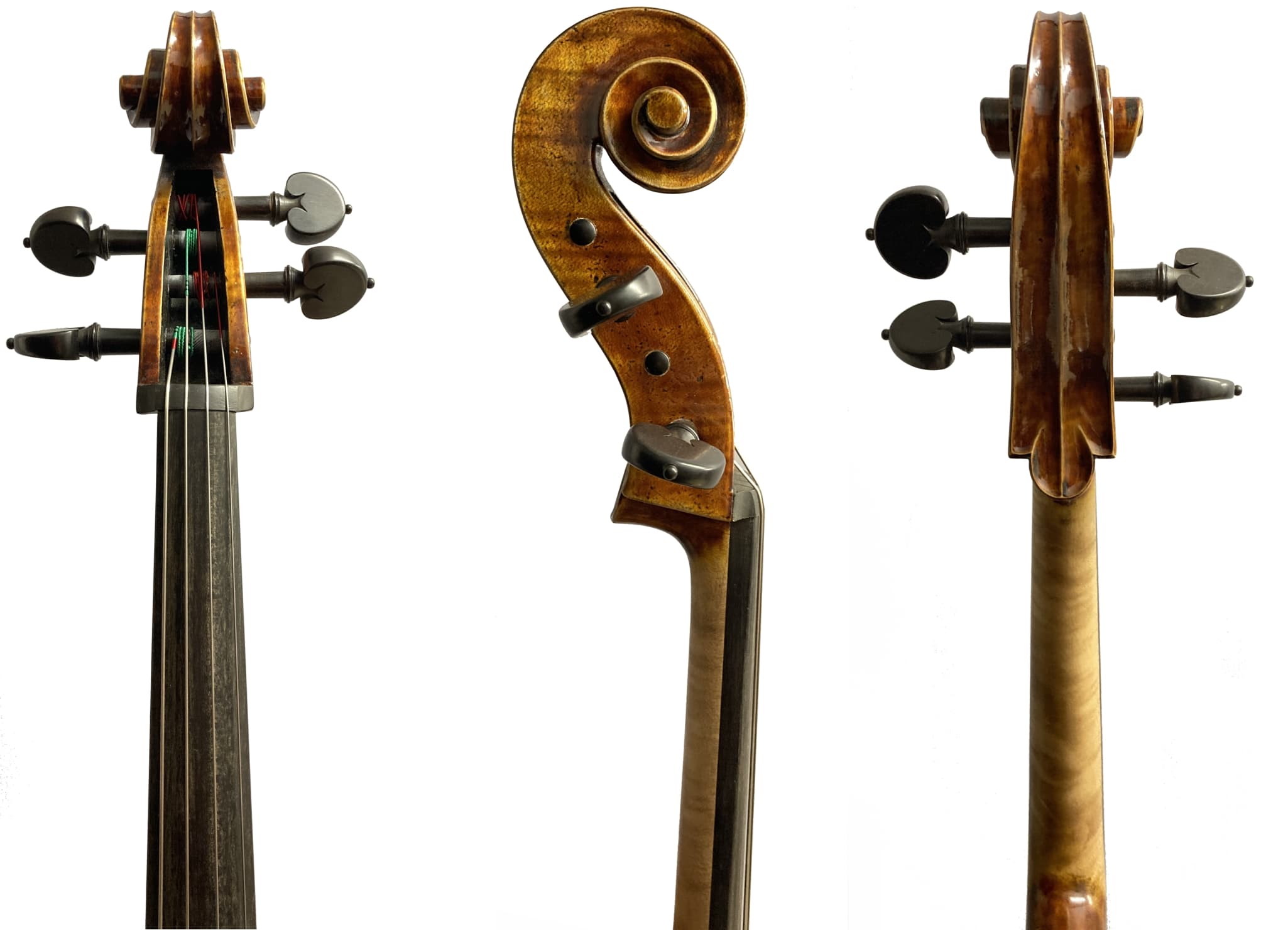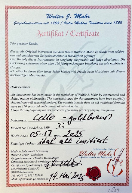 Schöne goldbraune Handlackierung - italienisch alt imitierend. Daher zeitloses Design: Das Instrument sieht weder alt noch neu aus. Engjährig gemaserte Fichtendecke. 2-teiliger, leicht geflammter Ahornboden. Alle Klanghölzer sind ca. 5 Jahre durch Lagerung natürlich getrocknet und ermöglichen einen schwingfreudigen Korpus. Feinstimmsaitenhalter mit 4 integrierten Feinstimmern. Ebenholzgriffbrett. Ebenholzwirbel in Herzform mit Zierring und Zierkugel. Karbonstachel.