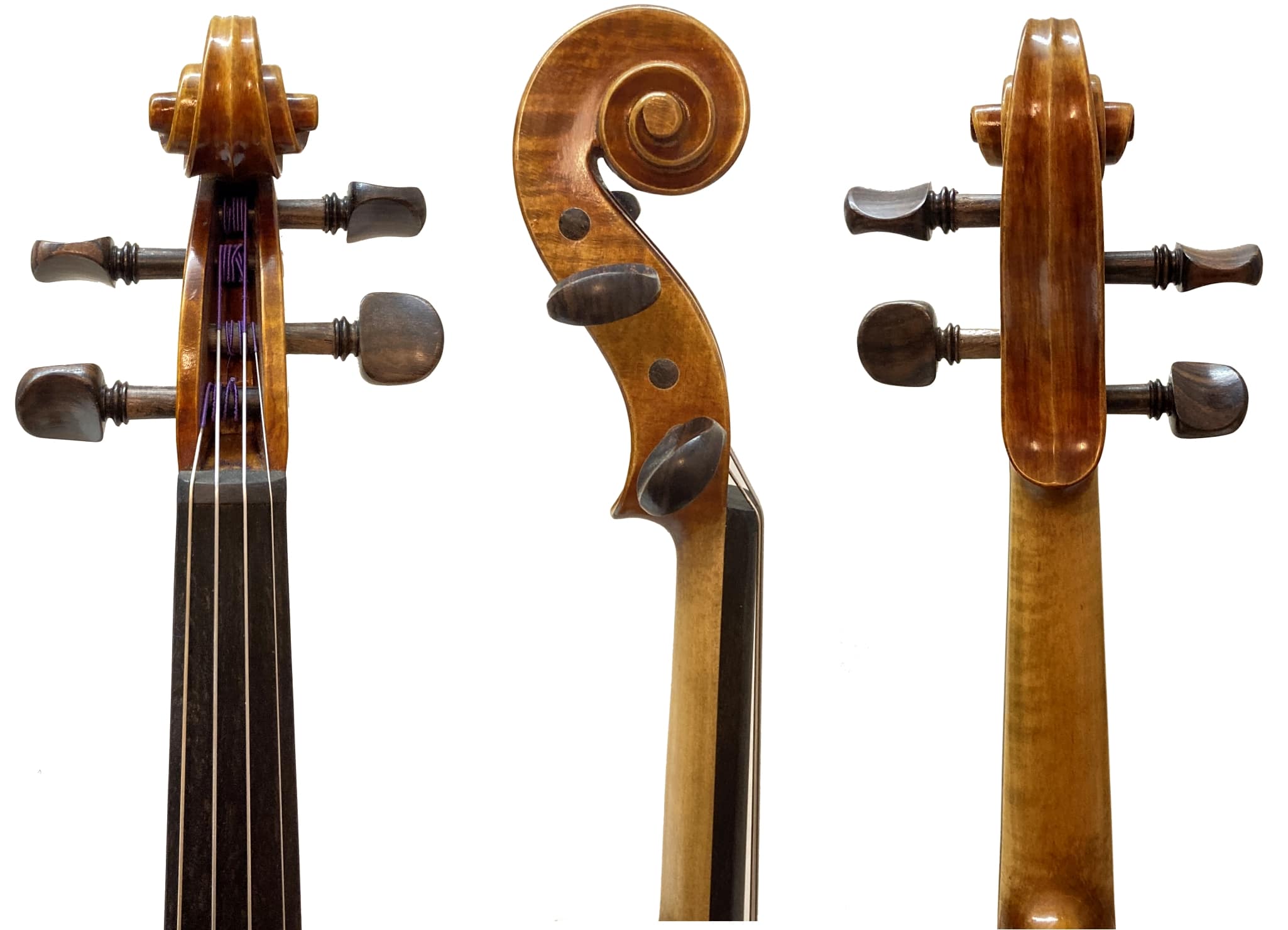 Die Holzauswahl ist sehr sorgfältig: Alle verwendeten Klanghölzer sind mindestens 3 Jahre durch Ablagerung natürlich getrocknet. Die Decke ist aus hochwertiger sehr gleichmäßig gemaserter Klangholzfichte. Der 2-teilige Ahornboden ist mittelstark, schön geflammt. Alle Holzoberflächen wurden ausschließlich mit Ziehklingen bearbeitet. Daher ein brillantes Lackbild, das die Schönheit des Holzes sichtbar macht.