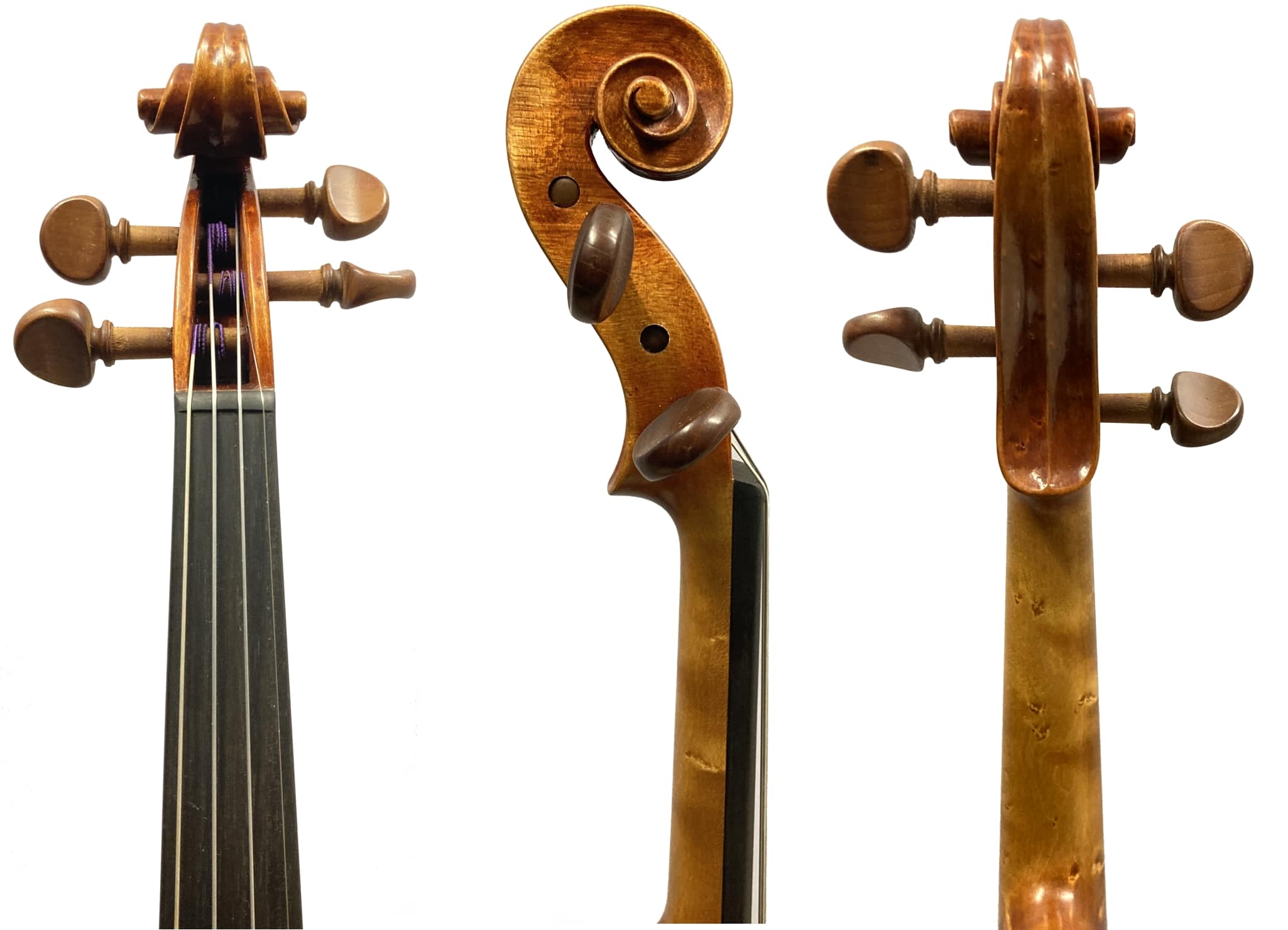 Die Decke ist aus ausgesuchter Klangholzfichte. Der einteilige Ahornboden ist aus Vogelaugenahorn. Schön gestochene Schnecke. Brillantes Lackbild, die Schönheit des Holzes kommt porentief zur Geltung.