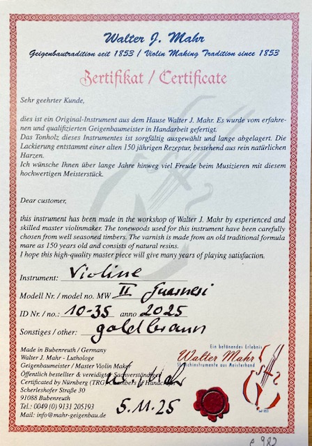 Geige Walter Mahr, Bubenreuth 2025, 4/4 Größe, Guarneri-Modell, sehr schöne Arbeit, Qualitätsstufe II - mit Mietkaufoption