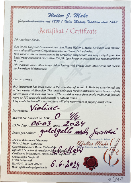 Zu diesem Instrument erhalten Sie ein Zertifikat von Walter Mahr über Originalität und Qualität.
