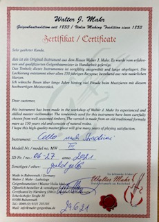 Das Cello hat eine Seriennummer, mit der es beim Erbauer registriert ist und die sich auf dem Zertifikat wie auch auf dem Zettel im Korpusinneren befindet.