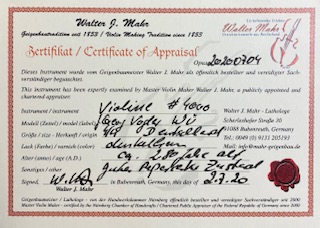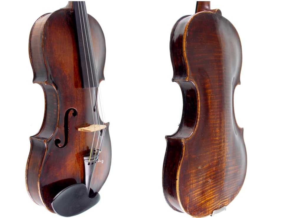 Die Geige ist in gutem repariertem Zustand. Im Innern sind 2 Reparaturzettel (siehe Bilder) einer von 1933, der andere ist leider nicht mehr lesbar. Die Geige ist recht hoch gewölbt. Der Klang warm, sonor mit dunklerem Timbre. Aber auch durchaus singend und brillant in den Höhen. Sowohl für den Sammler alter Geigen als auch für den ausführenden Musiker eine interessante Violine.