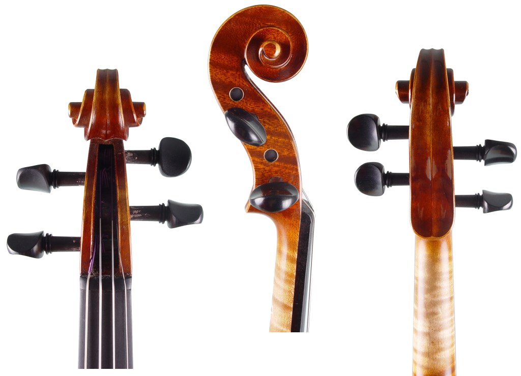 Wirbel, Griffbrett, Kinnhalter und Endknopf aus Ebenholz. Feinstimmsaitenhalter aus HighTec Verbundwerkstoff mit 4 integrierten Feinstimmern. Qualitätssaiten Pirastro Tonica.