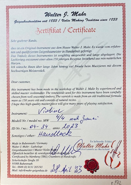 Zu diesem Instrument erhalten Sie ein Zertifikat von Walter Mahr über Originalität und Qualität.