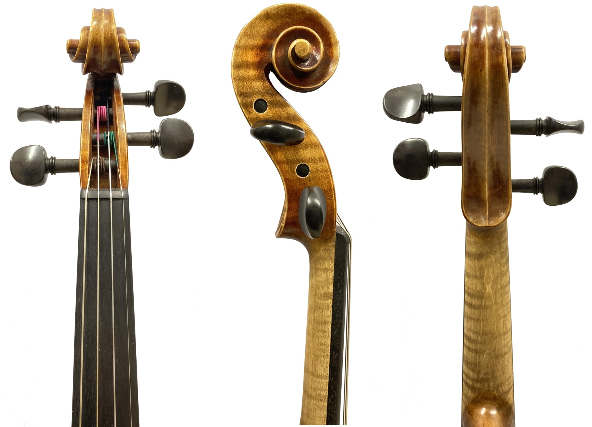 Massive Bauweise mit mindestens 3 Jahre abgelagertem Klangholz. Die Decke ist aus ausgesuchter Klangholzfichte, der zweiteilige Boden aus schön geflammtem Ahorn. Handlackiert mit Spirituslack. Goldgelber Farbton.