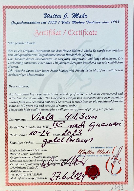 Meister Viola mit der Korpuslänge 41 cm, Qualitätsstufe IV - Bubenreuth anno 2023 - Meisterinstrument in Orchesterqualität