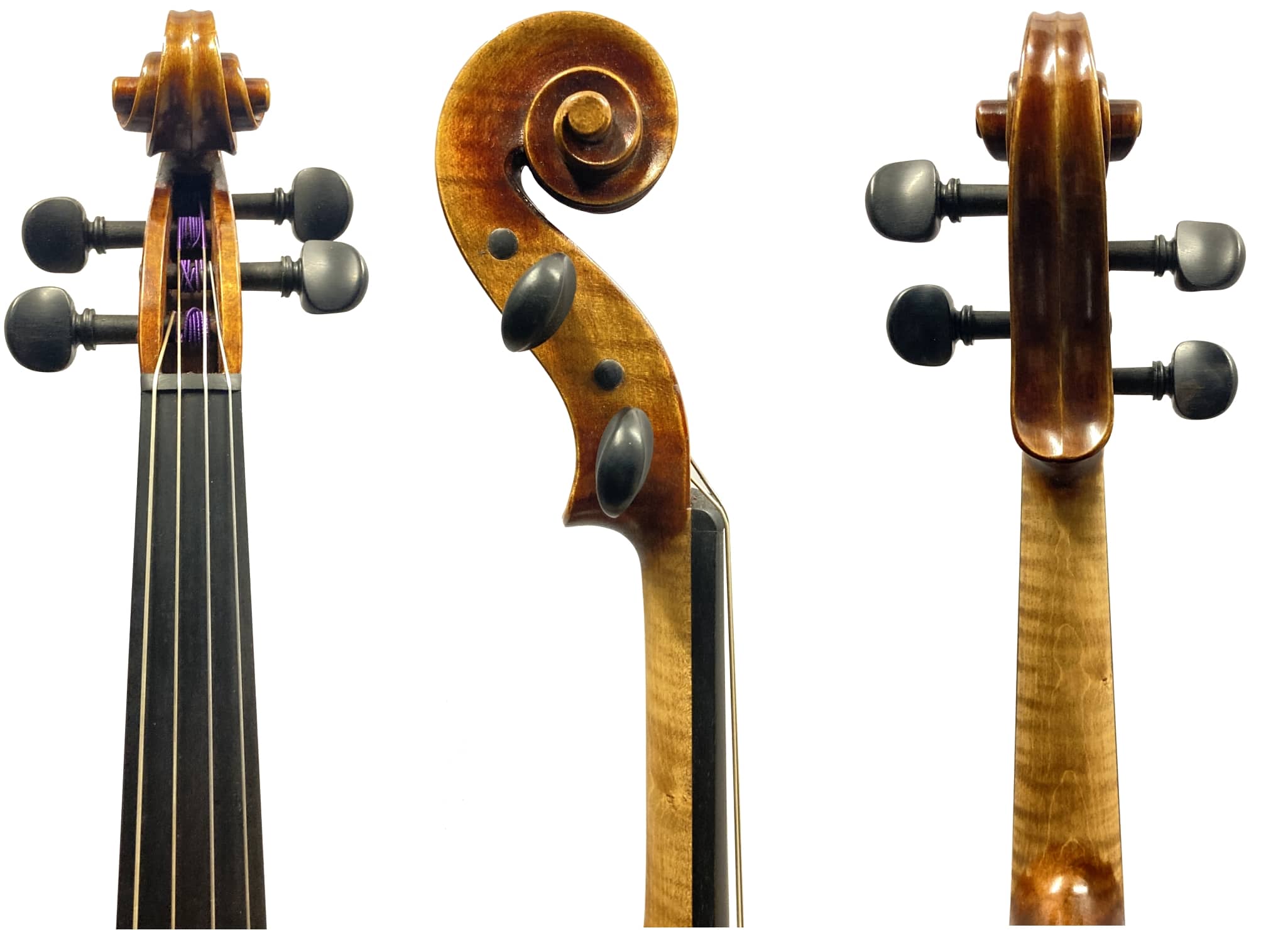 Der perfekt verlegte Einlagespan gibt den Konturen der Bratsche einen eleganten Abschluss. Die tief ausgestochene Schnecke ist kunsthandwerklich schön gearbeitet und ist eine Zierde für diese schöne Bratsche. Die Wirbel ebenso wie das Griffbrett und der Kinnhalter sind aus wertvollem schwarzem Ebenholz. Als Saitenhalter dient ein Wittner High Tec Verbundwerkstoff - Saitenhalter mit 4 integrierten Feinstimmern. Die Bratsche ist momentan mit den Qualitätssaiten von Thomastik Peter Infeld ausgestattet.