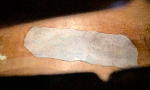 Ein solide reparierter Riss (innen belegt) am Boden (der reparierte Riss ist ca. 8 cm lang und befindet sich am linken Rand des Bodens). Ansonsten keine Risse am Korpus unter UV-Licht zu erkennen. Wirbelkasten angeschäftet. Dem Alter entsprechend guter reparierter Zustand. Vom Geigenbauer überholt: