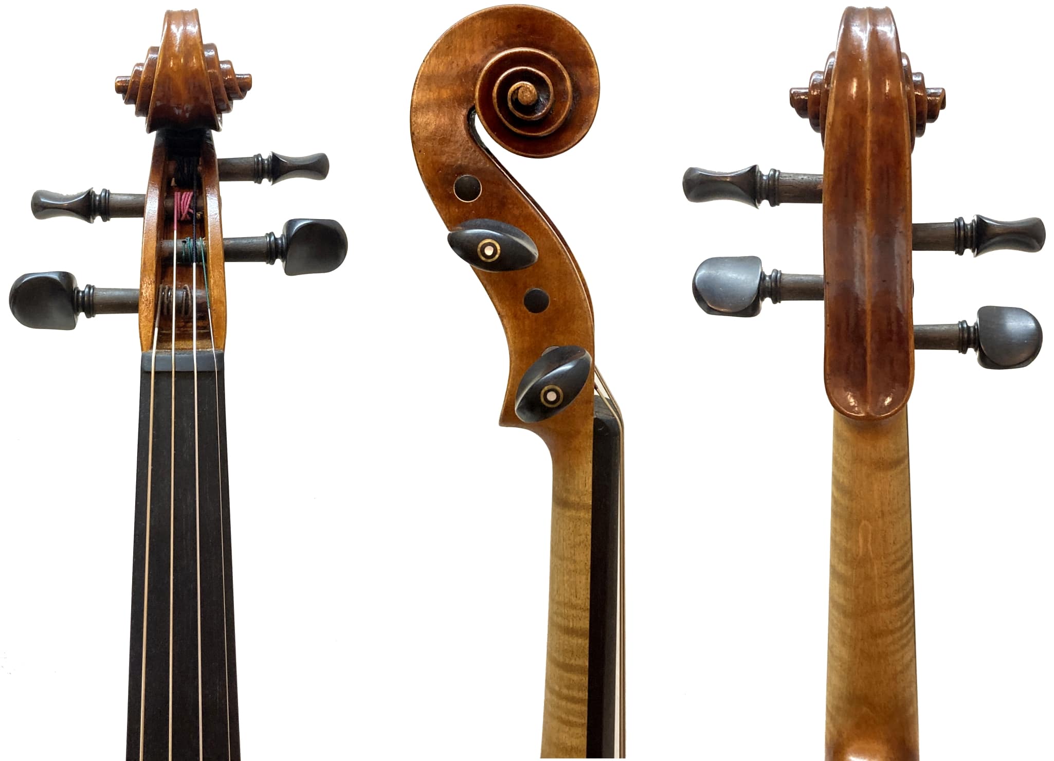 Lack: Durch die in vielen Schichten mit Pinsel aufgetragene Handlackierung kommt die Schönheit des Holzes porentief zur Geltung. Besonders schön: Exzellente italienisch alt imitierende Lackierung. Dadurch erhält das Instrument ein zeitloses Design.