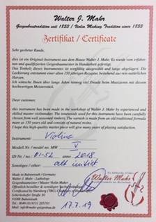 Violine der Qualitätsstufe V aus dem Jahre 2018 von Geigenbaumeister Walter Mahr aus Bubenreuth / Bayern mieten / leihen Mietkauf